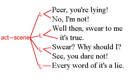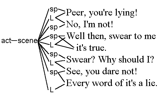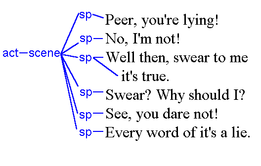 as shown in the <div1> tags.<sp who='Aase'><lb n="1"/> Peer, you're lying! </sp> <sp who='Peer'> No, I'm not! </sp> <sp who='Aase'><lb n="2"/> Well then, swear to me it's true! </sp> <sp who='Peer'><lb n="3"/> Swear? why should I? </sp> <sp who='Aase'> See, you dare not! <lb n="4"/> Every word of it's a lie! </sp>